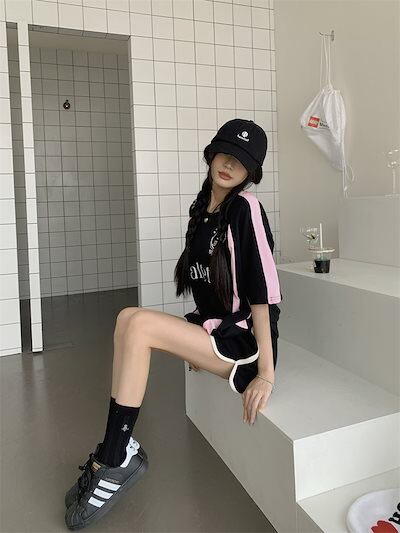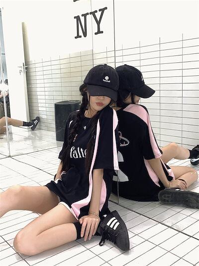2024 夏 韓国 甘い 可愛い風トップス Tシャツ ファッション系半袖スリムフィットサイドペイントシルエットゆったり丈 休日レディースサイズ韓国Vネック おしゃれカジュアルメンズライク T