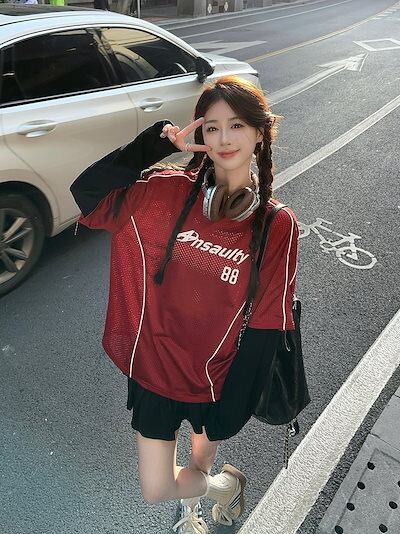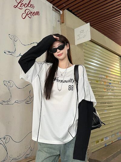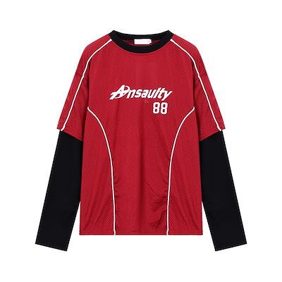 秋 韓国可愛い風トップス Tシャツ ファッション系 長袖 フェイクレイヤード サイド 重ね着シルエットゆったり丈レディース韓国サイズおしゃれ カジュアル メンズライク T