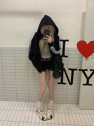 2024 秋冬トップス パーカー フード付き チャック 長袖 ストライプ ゆったり 細見え 白 黒 おしゃれ かわいい ガーリー キュート 甘め 韓国ファッション レディース お出かけフルトラック