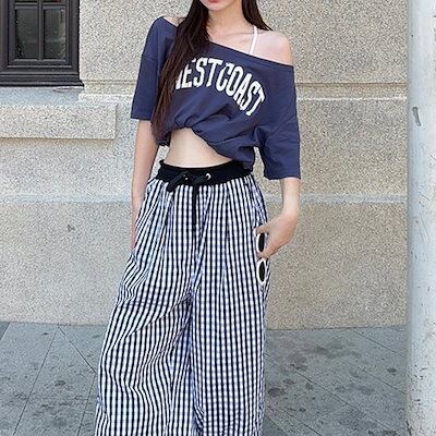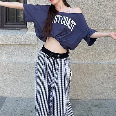 2024夏トップス Tシャツ 半袖 ワンショルダー 英語 肩見せ ゆったり 細見え 夏 ネイビー おしゃれ かわいい 韓国ファッション レディース お出かけ