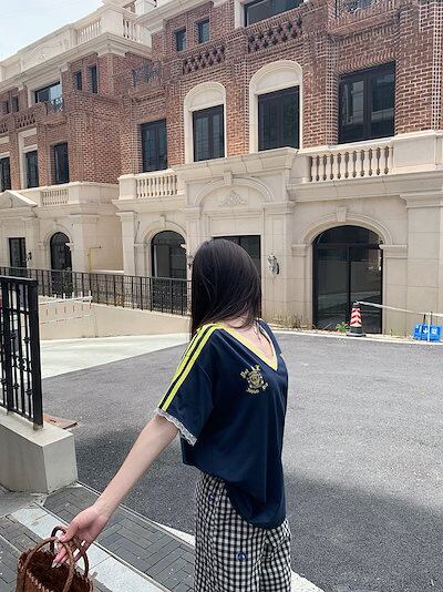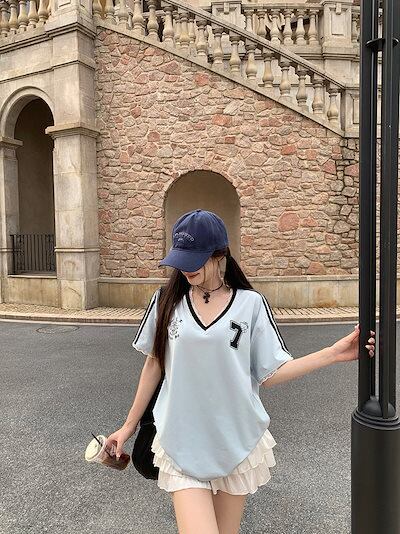 2024夏 韓国可愛い風トップス Tシャツ ファッション 半袖 スリムフィット ロングサイド ペイントシルエット ゆったり丈 休日レディースサイズ韓国Vネック おしゃれ カジュアル メンズライク T