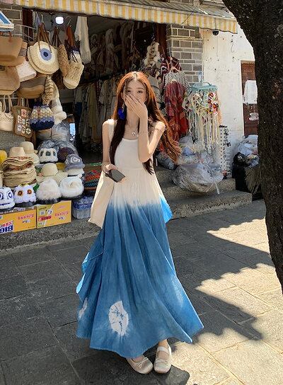 2024春夏タイダイ柄グラデーション キャミワンピース ノースリーブ ワンピース ロングワンピース 体型カバー レトロ 韓国ファッション レディース レトロ 大人可愛い