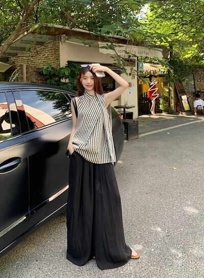 2024夏トップス シャツ ハイネック ストライプ ノースリーブ ゆったり 細見え 夏 黒 ブラック おしゃれ かわいい 大人っぽい 韓国ファッション レディース お出かけ