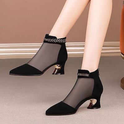 厚底シューズ ヒールパンプススニーカーシューズブーツ厚底2023春夏新作メッシュブーツチャンキーヒールサンダル中空通気性メッシュミッドヒールメッシュブーツレディース 韓国ファッション サンダル さんだ