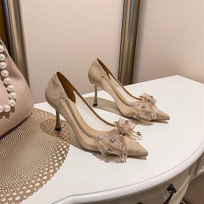 厚底シューズ ヒールパンプススニーカーシューズブーツ厚底 リボンの網糸細ヒール女性2023年春夏新型気質尖ったパンプス女性レディース 韓国ファッション サンダル さんだる