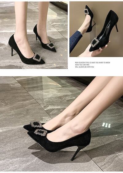 2023尖ったハイヒールの女細と黒の正方形ボタン付き単靴2023新春モデル百合中と婦人靴春秋ヒールパンプス韓国ファッション