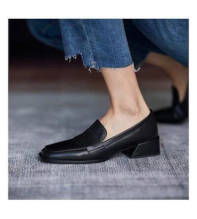レトロな英国風スモール革靴女性甘皮黒太ヒールハイヒール単靴中ヒール深口角頭春秋婦人靴ヒールパンプス韓国ファッション