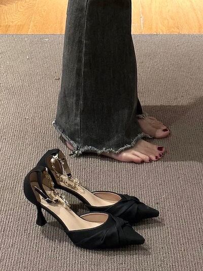 黒のハイヒールの女性のデザイン感小衆尖頭真珠の一字帯単靴細とヒールパンプス韓国ファッション