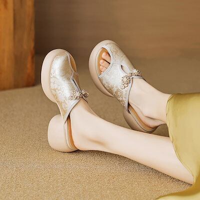 厚底サンダル レディース 夏新中式グリーン厚底半包頭スリッパ女夏レトロプリント ビーチサンダル 美脚 スポーツ 通気 歩きやすい フラットサンダル