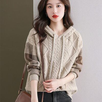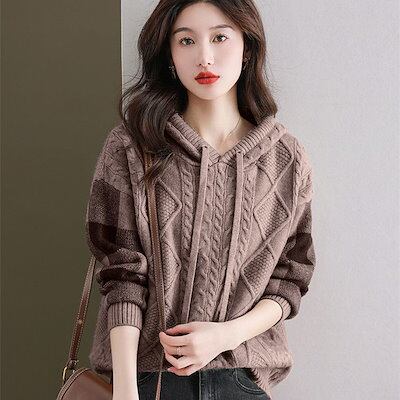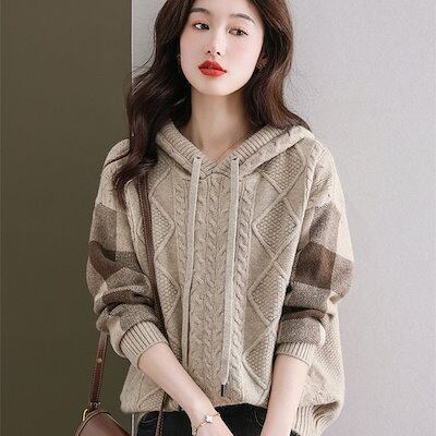 【質感注目させ】 売れ筋 着痩せ効果 チェック柄 シンプル フード付き ニットセーター レディース