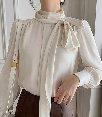 ブラウスボウタイブラウスレディーストップスシャツインナー白シャツスーツインナービジネススーツ秋韓国韓国ファッション長袖ボウタイオフィスカジュアルフォーマル上品通勤オフィスお呼ばれ卒業式小顔効果体型カバ