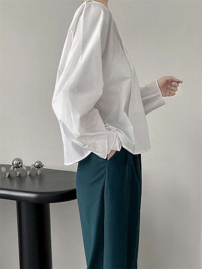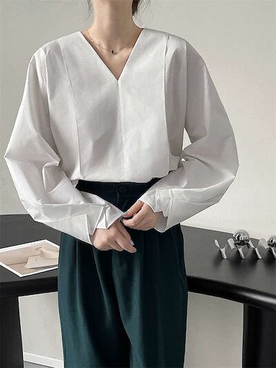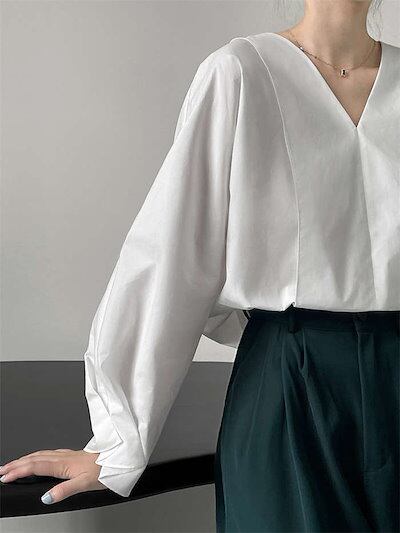 ブラウスレディーストップスシャツインナー白シャツスーツインナービジネススーツコットン秋Vネック長袖シンプル小顔効果体型カバー二の腕カバーオフィスカジュアルフォーマル通勤オフィスお呼ばれ入学式卒業式