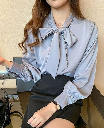 ブラウスレディースシャツインナートップススーツインナービジネススーツ白シャツ秋ボウタイカラー長袖ボウタイリボンリボンタイボウタイリボンオフィスカジュアルフォーマル体型カバー小顔効果大きいサイズ通勤お呼