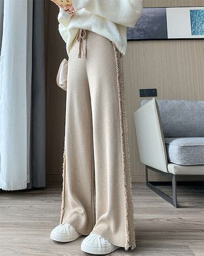 ニットパンツ レディース リブニット ボトムス ワイドパンツ ロングパンツ フレアパンツ 秋冬 秋 冬 タッセル 伸縮性 春 ストレートパンツ ウエストゴム ニット リブ ゆるパンツ リラックス 楽ち