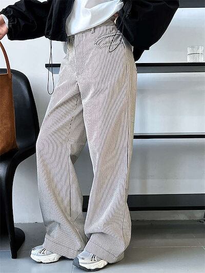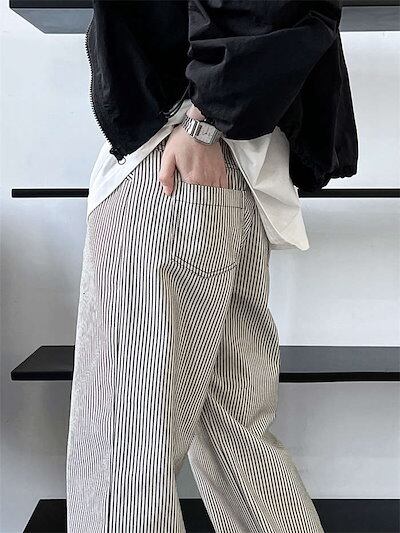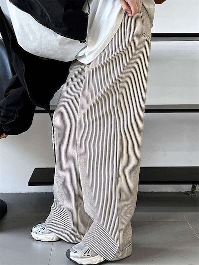 パンツ ワイドパンツ レディース ストライプ柄 春 秋 冬 長ズボン ロング丈 チノパンツ ポケット付き タックパンツ シンプル 柄パンツ 綿 コットン ゆったり 体型カバー ボトムス ストレート 個