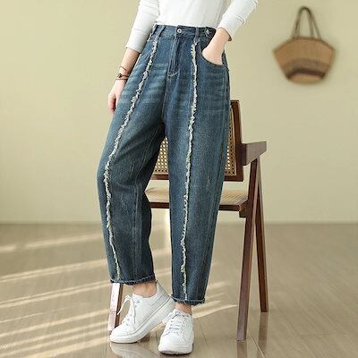 ワイドパンツ コントラストカラー デニムハーレムパンツ レディース カジュアル 9分丈パンツ 伸縮性のあるウエスト デニムパンツ テーパードパンツ