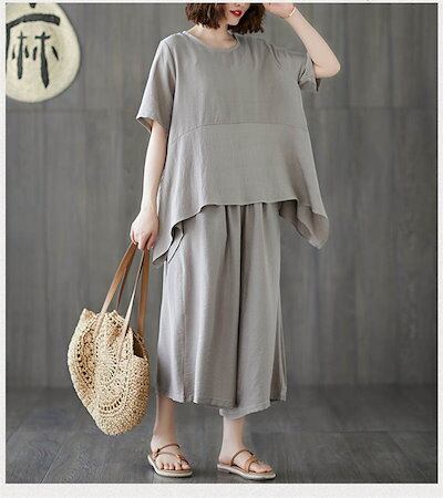 セットアップ レディース カジュアル 夏 綿麻風 2点セット 上下セット チュニック ブラウス ワイドパンツ tシャツ 半袖 バギーパンツ イージー フレアパンツ 涼しい カジュアル ナチュラル 大き