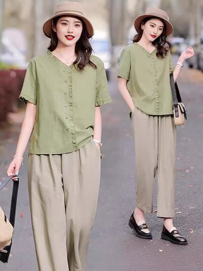 涼しく楽ちんセットアップ 綿麻スーツ新型婦人服2024夏モデル中年ママ半袖九分パンツ セットアップ レディース 夏 韓国 半袖 ルームウェア スウェット上下セット スーツ