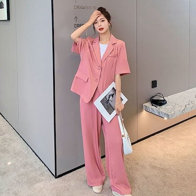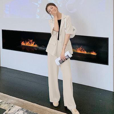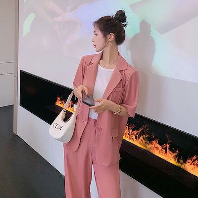 涼しく楽ちんセットアップ オーバーサイズスーツ 夏 2024新型 半袖+カジュアルワイドパンツ 2点セット レディース 韓国ファッション