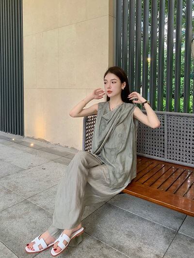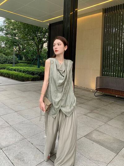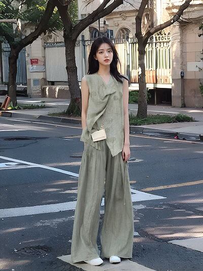 涼しく楽ちんセットアップ スーツ 夏2024新作 レトロなノースリーブベスト トップス+ワイドパンツ 2点セット レディース 韓国ファッション