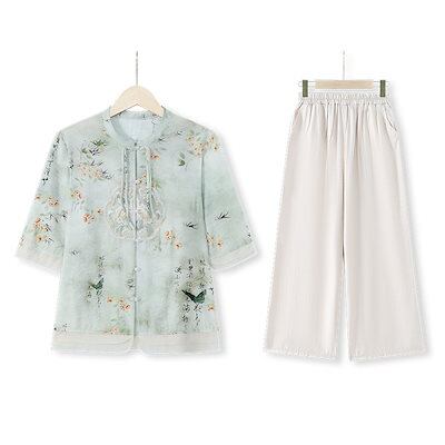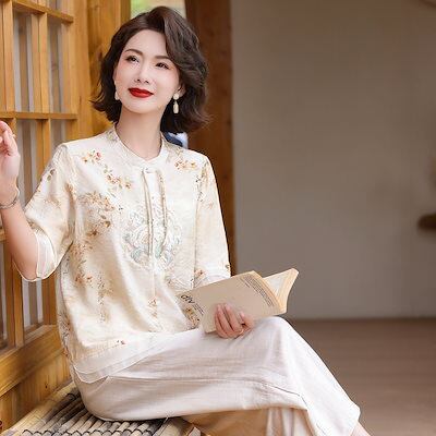 涼しく楽ちんセットアップ レディース 夏 お母さんの夏服綿麻スーツ2024新中式老年女性の夏の半袖国風シャツ2枚セット ルームウェア セットアップ スウェット上下セット スーツ