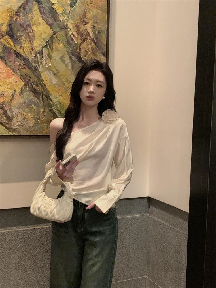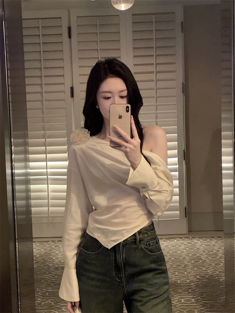 気質を改善する 斜め肩の服 シャツ ブラウス お出かけ 2023秋 一言の肩 ゆったりする 半袖 sweet系