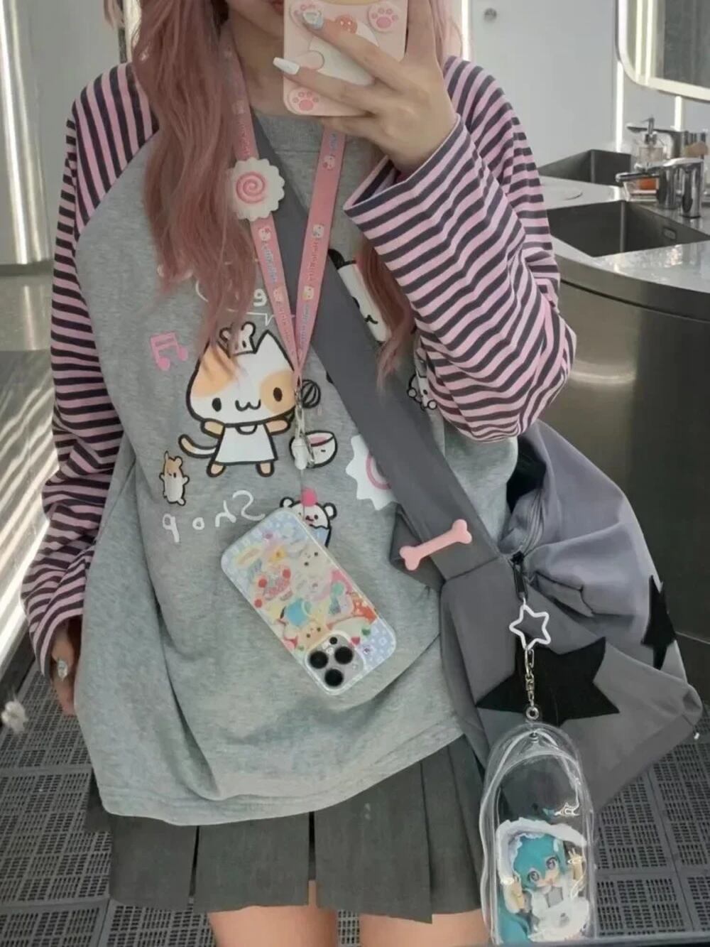 Houzhou-女性のストライプパーカー、漫画のプリントトレーナー、パッチワーク、原宿、カワイイ、日本のファッショナブル、y2k、新しい秋、2023 パーカー ジャージ y2k T240908171044_01