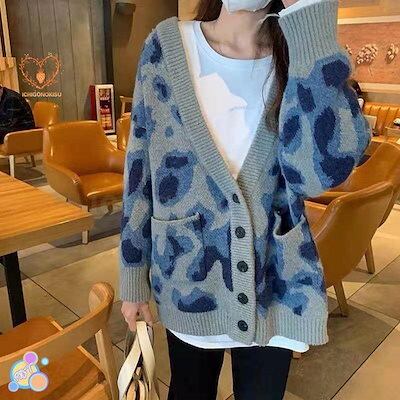 ヒョウ柄セーターカーディガンレディース秋冬韓国風ゆったりミドル丈レトロアウターセーター