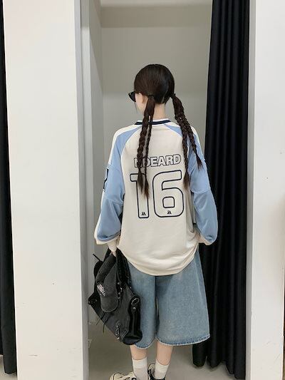 2024 秋冬 トレンド トップスVネックバイカラー長袖 かわいいK-POPTロング黑白レディース韓国風ロゴ衣装ルーズゆったりカジュアルおしゃれサイズスリーブシルエットファッション系サイドシャツフット