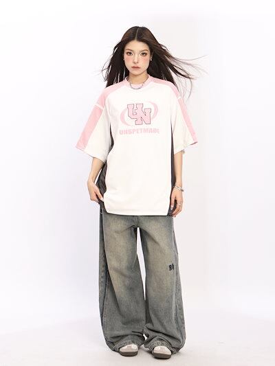 2024 秋冬 トレンド トップスバイカラー甘辛MIX半袖 かわいいTシャツレディース韓国風ロゴ衣装ルーズゆったりカジュアルおしゃれサイズスリーブシルエットファッション系サイドシャツフットスウエット春