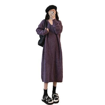 ゆったりvネックセーターワンピース韓 風長袖ニットワンピースレディース2024秋冬新作スタイルインナーとアウター