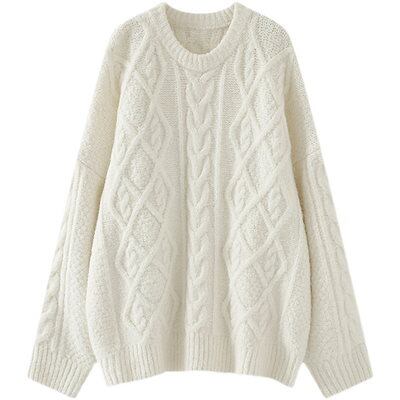 レディースプルオーバーツイストセータールーズアウターウェア2024秋冬新作ホワイトニットトップレイジースタイルセーター