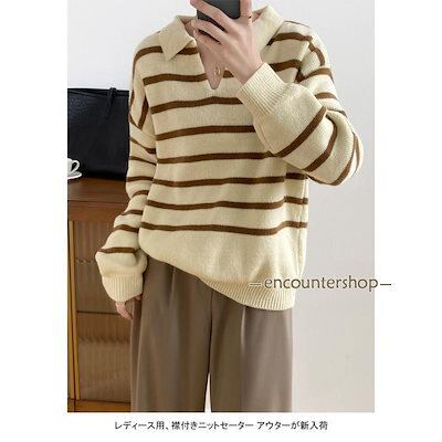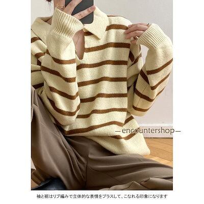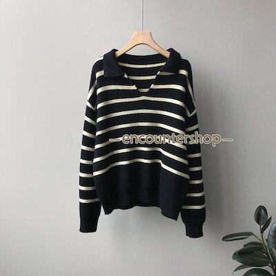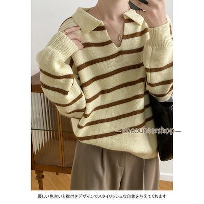 ニットセーター レディース アウター 配色 ボーダー柄 折り襟 長袖 リブ編み 切り替え 柔らかい 暖かい ゆったり シンプル 秋冬