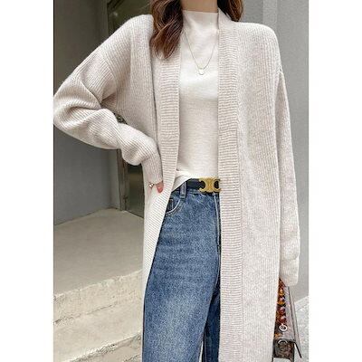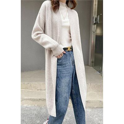 ニットカーディガン レディース 長袖 ロング丈 ノーカラー 厚手 ドロップショルダー アウター 羽織り 前開き 無地 ゆったり 大きいサイズ 暖かい 通勤 きれいめ
