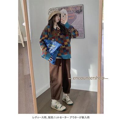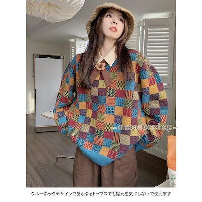 ニットセーター レディース アウター 配色 チェック柄 クルーネック 長袖 リブ編み 切り替え 柔らかい 暖かい 大人可愛い 秋冬