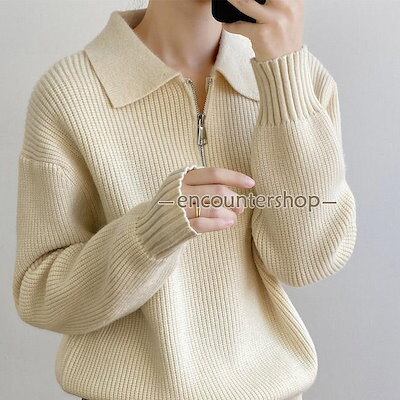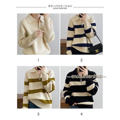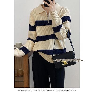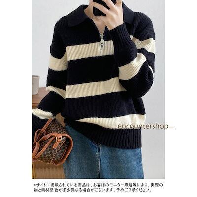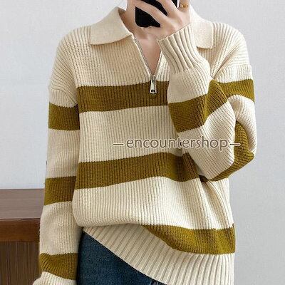 ニットセーター レディース アウター 配色 ボーダー柄 ハーフジップ 長袖 リブ編み 切り替え 柔らかい 暖かい ゆったり 秋冬