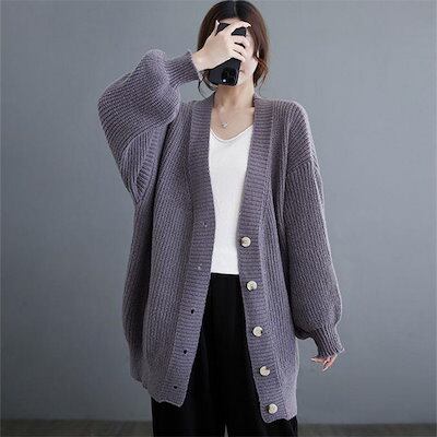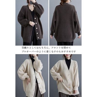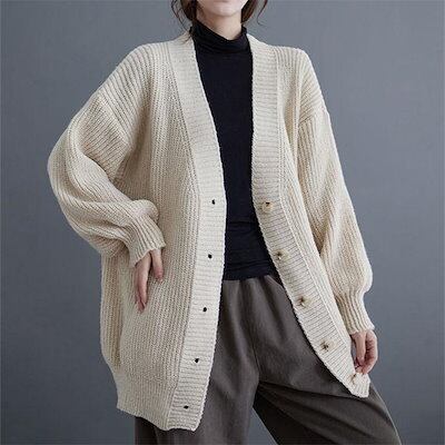 ニットカーディガン レディース 長袖 アウター ミディアム丈 セーター パフスリーブ 無地 Vネック リブ編み シングル 前開き ゆったり 厚手 暖かい 通勤 オフィ