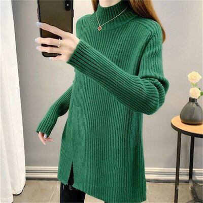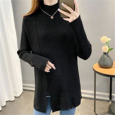 ニットセーター レディース 秋冬 チュニック リブニット ハイネック 長袖 スリット リブ ニット セーター プチハイネック 無地 プルオーバー カットソー 暖かい 柔らかい トップス シンプル ニッ
