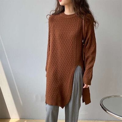 ニット セーター レディース リブ トップス リブニット 秋冬 きれいめ クルーネック 長袖 ケーブル編み ゆったり シンプル チュニック セーター プルオーバー ニットチュニック ロングニット スリ