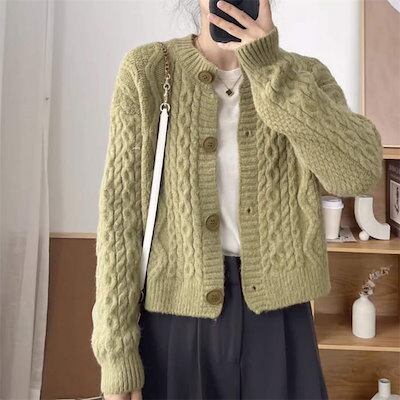 セーター レディース 秋冬 カーディガン クルーネック リブニット ケーブル編み 厚手 ニット トップス ショート丈 長袖 体型カバー ニットウェア 暖か 防寒 シンプル カジュアル きれいめ おしゃ