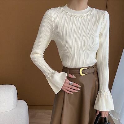 パール付きニット ニット レディース トップス ニットプルオーバー 長袖 パール 無地 ハイネック シンプル きれいめ 高級感 上品 セーター リブニット フレア タイト フォーマル エレガント きれ