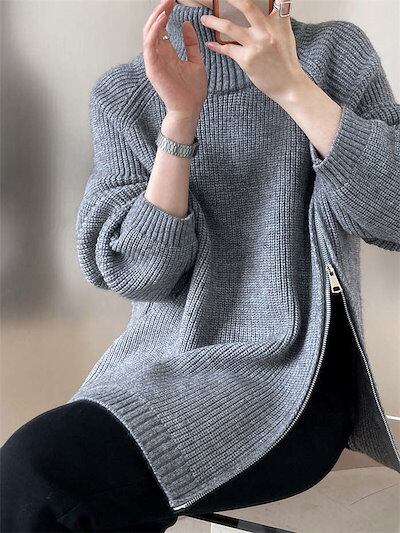 セーター レディース ボリューム袖 長袖 トップス ハイネック ニット 秋冬 ハイネック 体型カバー 厚手 あったか リブニット 前開き ジップ スリット レイヤード 無地 ファスナー 二の腕カバー
