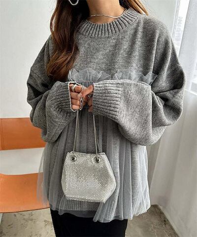 ニット セーター 切替 レディース チュール ニットセーター トップス ブラウス ラウンドネック 無地 秋冬 長袖 無地ニット 防寒 冬 チュール切替 フレア チュニック 黒 リブニット ケーブル編み