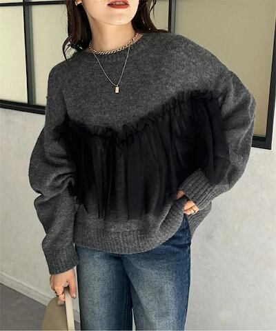 ニット トップス レディース セーター 長袖 チュール 切替 ニット ドッキング ビスチェ風 体型カバー タートルネック ニットウエア プルオーバー あったか ゆったり シンプル 大人 カジュアル