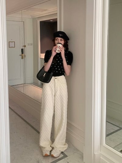 2024 春夏パンツ デニム ジーンズ モップパンツ ジャガード 菱形 ワイド ストレート ハイウエスト 脚長効果 美脚効果 細見え 春 白 ホワイト カジュアル 韓国ファッション レディース お出か
