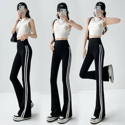 ワイドパンツ レディース 長パンツ 黒マイクロサメパンツ女性ハイウエストパンツストライプパンツポケットロングパンツ春夏ラッパパンツ ハイウエストパンツ ワイドパンツハイウエスト スラックスパンツ