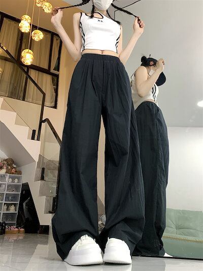 2024春夏パンツ ロング丈 ワイド ストレート ウエストゴム ハイウエスト 美脚効果 脚長効果 細見え 夏 白 黒 青 韓国ファッション レディース かわいい おしゃれ カジュアル お出かけ