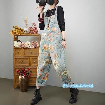 サロペット レディース サロペット パンツ オーバーオール オールインワン サスペンダー 体型カバー 着痩せレデニムサロペット プリントB43