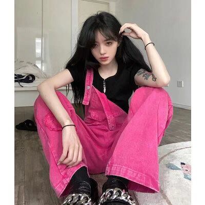 夏ピンクフライストリートデニムワイドレッグストレートオーバーオールレディース新作トレンドゆったりオールマッチスリム