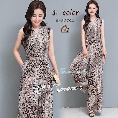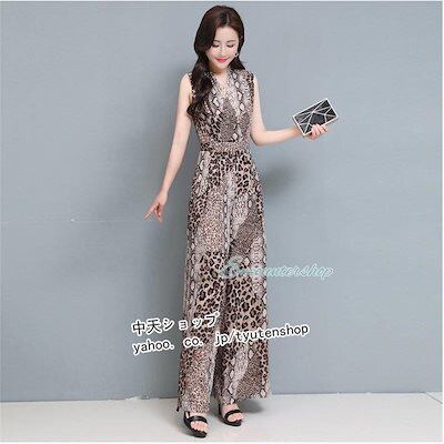 オールインワンレディース20代30代40代 オーバーオール ガウチョパンツ ヒョウ柄 シフォン ノースリーブ 夏 通勤 お呼ばれ 着痩せ オシャレ 大きいサイズ 韓国風